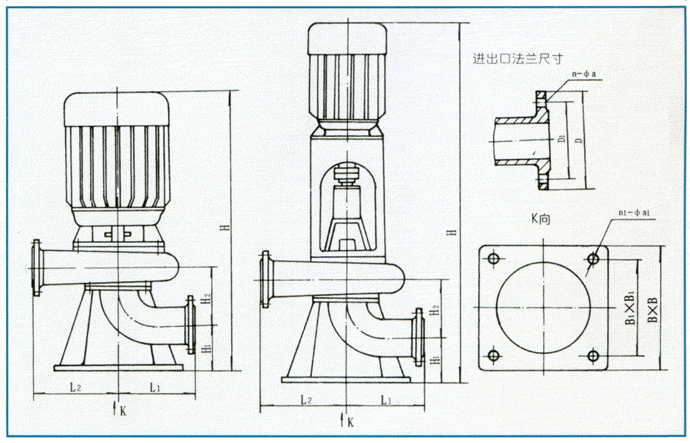 該系列泵具有兩種結構形式,一是電機與泵直接同軸,二是采用聯軸器聯接,電機采用標準立式電機。其結構圖如下,每種結構形式具有兩種底座連接形式,一是進口水平吸入,具有轉角功能,可根據使用要求,進出口安放成0°、90°、180°、270°,便于管路連接,二是進口軸向吸入,便于立式安裝。