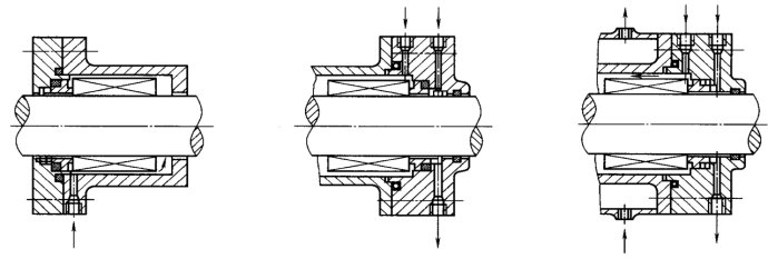 圖1--24沖洗冷卻機(jī)械密封裝置 圖1—25靜環(huán)背部引入冷卻水 圖1—26密封腔外加冷卻水套